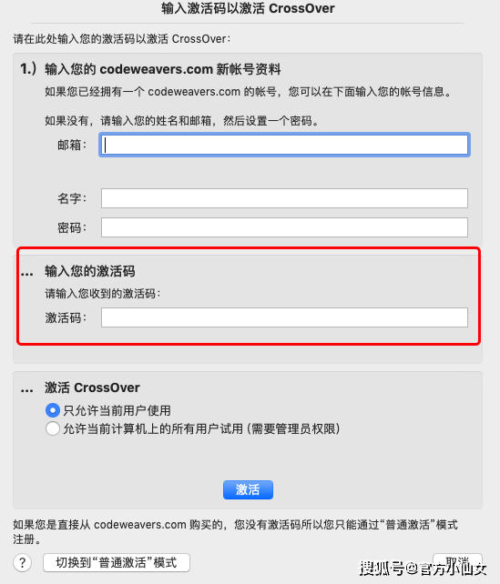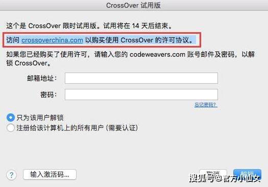 2、随后在激活界面中,输入收到的激码,选择允许使用的计算机用户后,单击“激活”按钮进行激活。激活以后就可以免费使用CrossOver软件,即使软件更新也可以免费升级,无需收费。