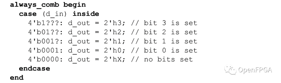 同样的优先级编码器也可以通过使用case语句来建模。(下例使用了一种称为reverse case语句的编码风格)。