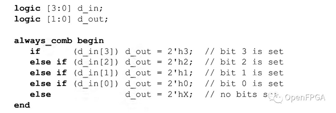 SystemVerilog对if-else-if决策序列和case语句的语义是:按顺序计算一系列选择-只执行第一个匹配的分支。这种行为使得表示优先级编码逻辑成为可能,即其中一种选择优先于另一种选择。下面的代码片段演示了一个以if-else-if决策链建模的4-2优先级编码器,其中高阶位优先于低阶位。