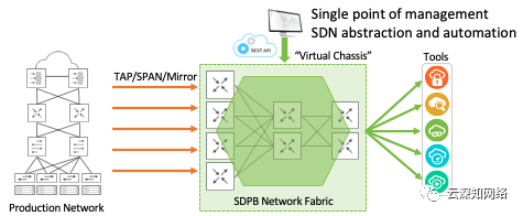 SDPB建立在解耦的网络交换机基础之上,使用开放网络钟爱的白盒硬件和开放网络操作系统(NOS)软件。利用软件定义网络SDN原理对具有NPB策略和服务(如过滤和复制)的白盒交换机进行编程。