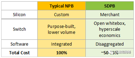 SDPB可以通过两种方式大幅降低资本支出。首先,在同等容量(端口数、总吞吐量)的情况下,基于商用芯片+开放网络硬件的SDPB可以降低25%-50%的成本;