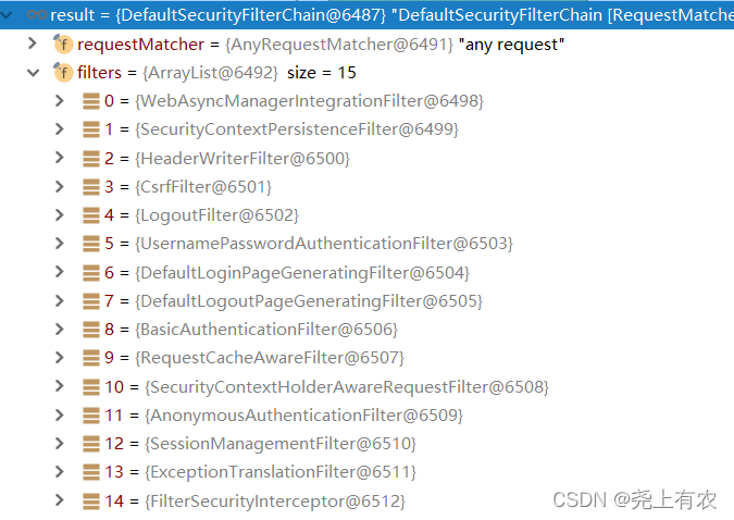 我们可以通过Debug查看当前系统中SpringSecurity过滤器链中有哪些过滤器及它们的顺序。