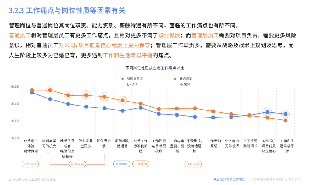 比如说互联网新兴设计人才白皮书中提到的“工作痛点与岗位性质等因素有关”,此处会对人群进行了细分对比,对比管理类员工和普通员工。