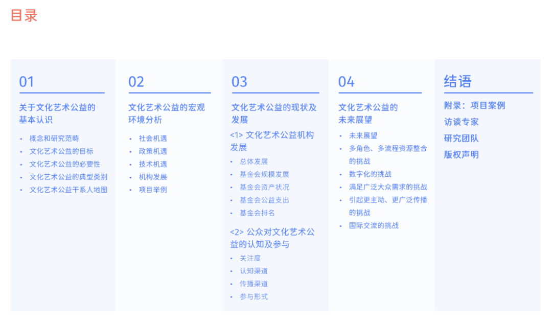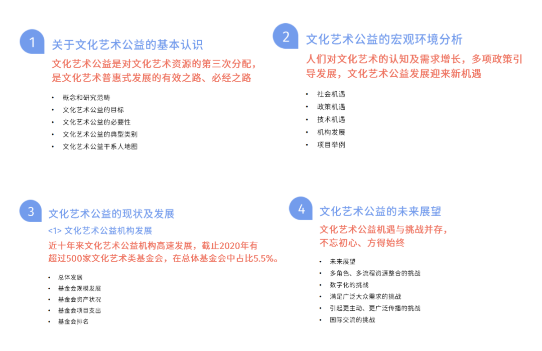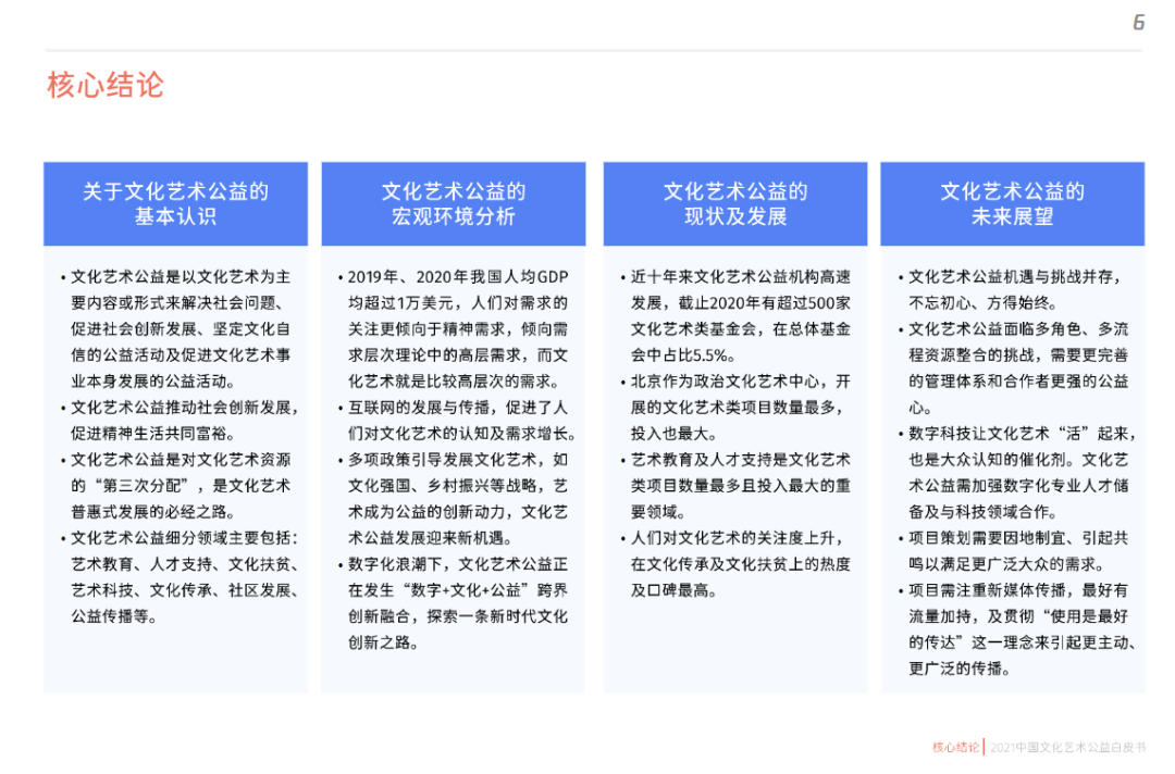 建议所有报告在正文前面都要有3-5个核心结论(key finding),最好是3个。我们经常会听到“3句话把这个事情讲清楚”“最核心的3个结论是什么”,毕竟考虑到读者的时间,报告要先说最重要的事情。比如文化艺术公益白皮书的核心结论页。