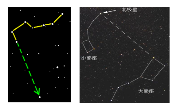 北极星:北极星位于地球地轴的北端,在北斗七星中的天璇与天枢连线的五倍延长线上。因地球的自转,而北极星又处于天球转动的轴上,所以相对其它恒星静止不动。(但是北极星并不是完全处在北天极正中央位置,实际上它是以很缓慢的速度转圈,相对其他恒星而言看起来不会变化而已。北斗七星,是指大熊座的天枢、天璇、天玑、天权、玉衡、开阳、摇光七星。古代中国人民把这七星联系起来想象成为古代舀酒的斗形。)