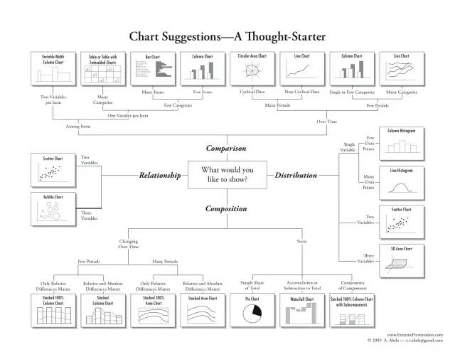 换位思考,可以善用可视化图表来帮助表达,发挥PPT的Power Point能力(做PPT的目的是为了有效地沟通和展示)。关于可视化的文章已经有很多了,这里引用了一个常用图表及其适用场景。