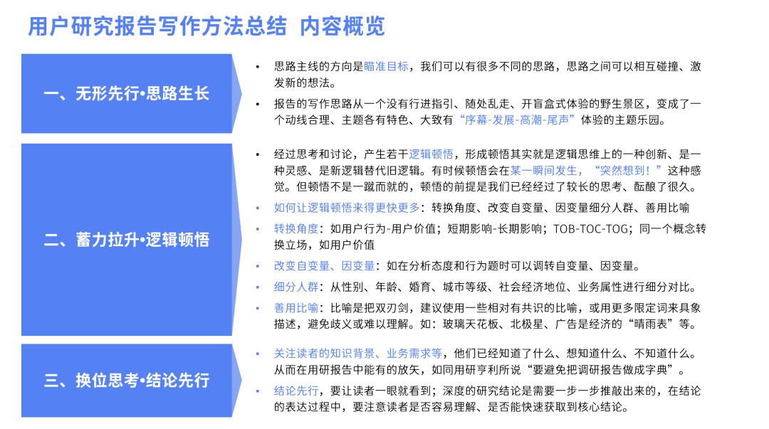 本文主要总结了用研报告写作的三个步骤(核心内容见下图),以白皮书报告为案例(本来有产品型用研的案例,但案例敏感,本文为对外版本,对案例进行了删减),浅显总结了用研报告的研究写作,不算是系统的方法论总结,但还是希望可以为大家带来一定的启发。在研究写作的道路中,还有很多我需要学习的内容,写下此文也是为了提醒自己,学无止境。