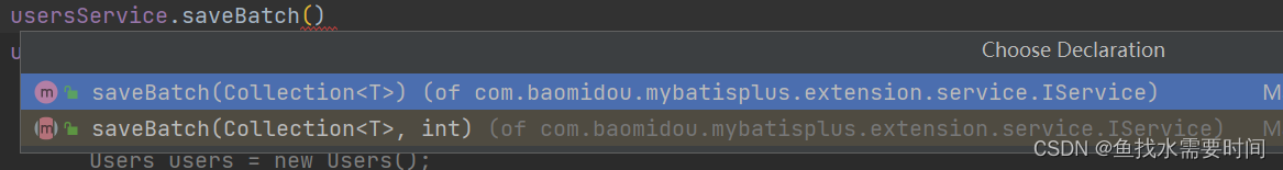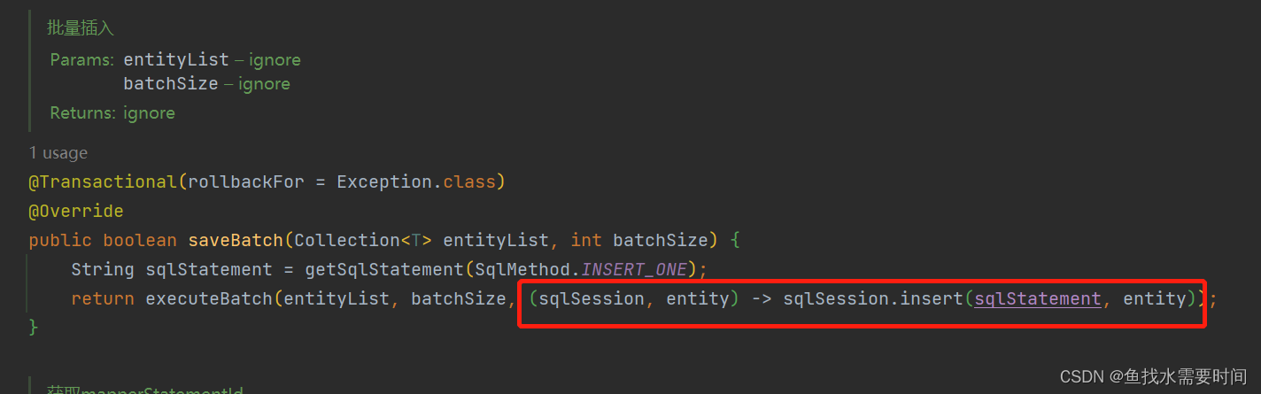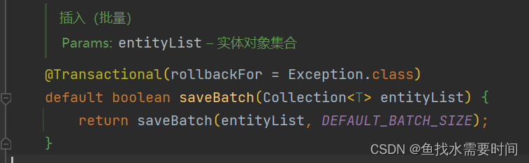 这里也有一个事务的注解,这是因为saveBatch是一个重载方法,插入的时候也可以指定插入批次数量调用