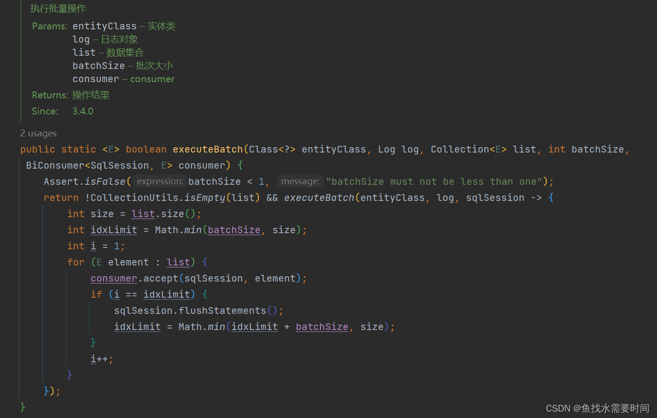 这里就是真正执行的方法了,idxLimit会对比DEFAULT_BATCH_SIZE和集合长度两个数中的最小数,作为批量大小,也就是说当集合长度不够1000,那么执行的时候批量大小就是集合的长度,就执行一次。