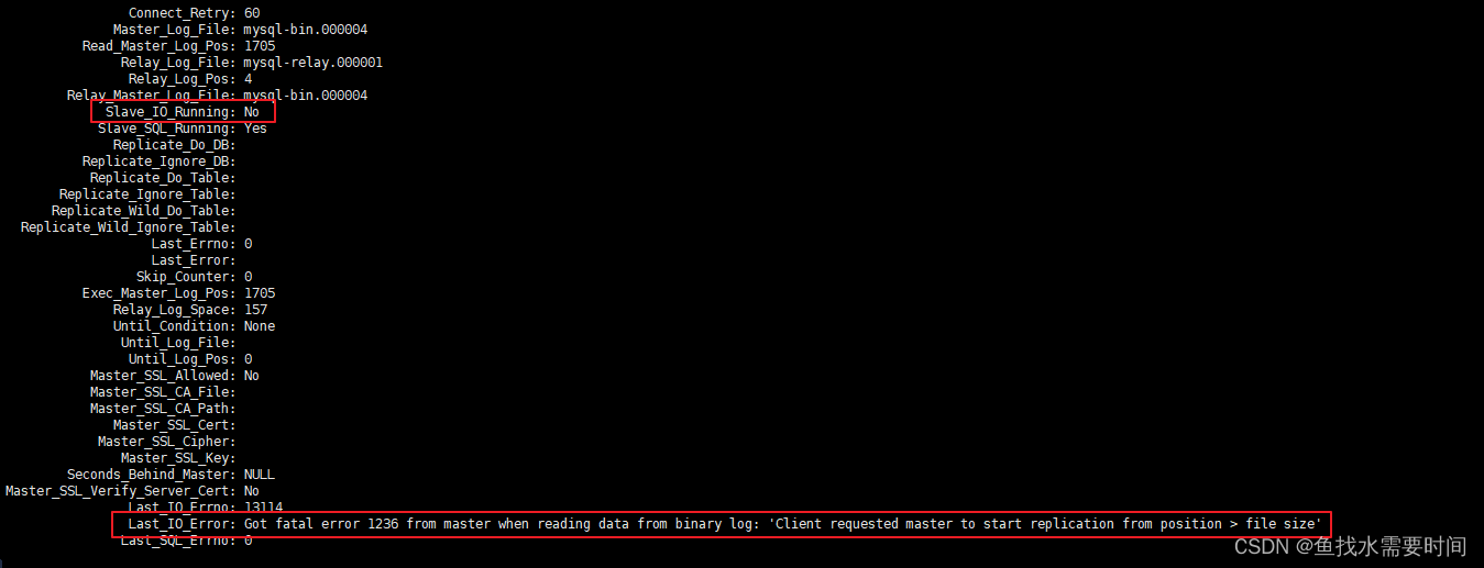 典型的错误例如:Last_IO_Error: Got fatal error 1236 from master when reading data from binary log: 'Client requested master to start replication from position > file size'