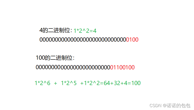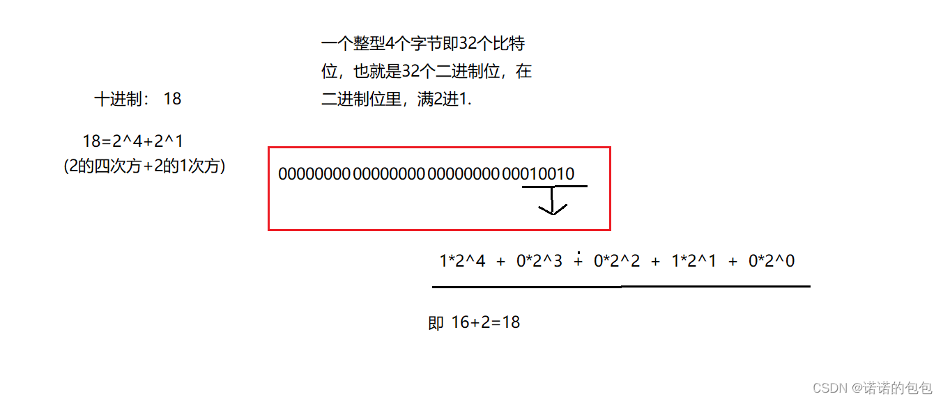 首先我们要知道一个整数的二进制位怎么表示。我们日常见到的数,都是以十进制的形式表现出来的,即用0-9来表示,而在二进制里,只能用0和1来表示一个整数,大家看如下图形就很好理解了: