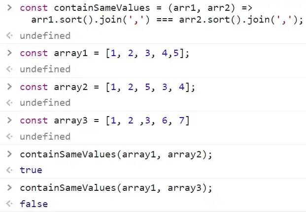 我们可以使用 Array.sort() 和 Array.join() 方法组合起来检查两个数组是否包含相同的值。