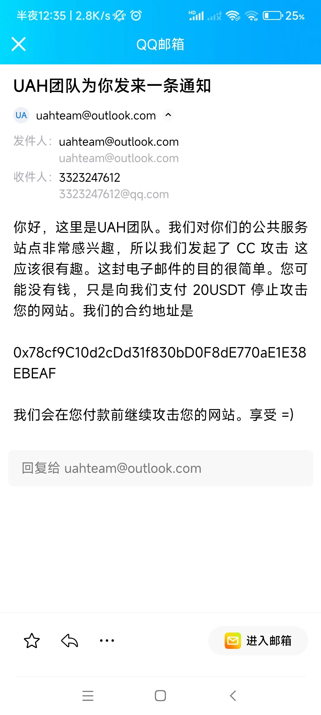 收到了邮件,竟然是勒索。