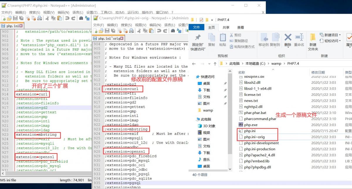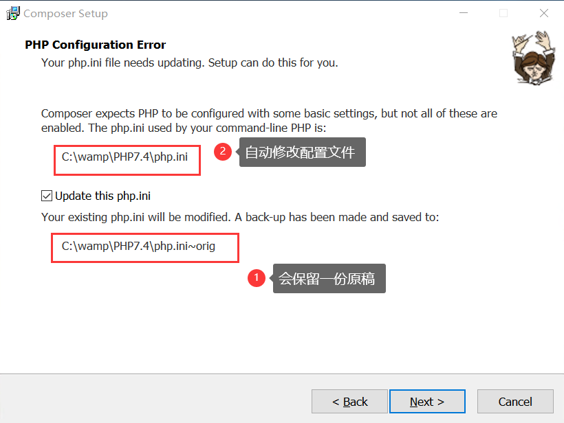 (3) 安装composer需要开启一些扩展,未开启的扩展安装程序会自动修改配置文件开启需要的扩展,提示将要修改配置文件,并保留一份修改前的原稿