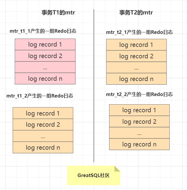 一个 mtr 执行过程中可能产生若干条Redo日志,这些Redo日志是一个不可分割的组,所以其实并不是每生成一条Redo日志,就将其插入到log buffer中,而是每个 mtr 运行过程中产生的日志先暂时存到一个地方,当该 mtr 结束的时候,将过程中产生的一组Redo日志再全部复制到log buffer中。我们现在假设有两个名为T1、T2的事务,每个事务都包含2个 mtr ,我们给这几个 mtr 命名一下:
