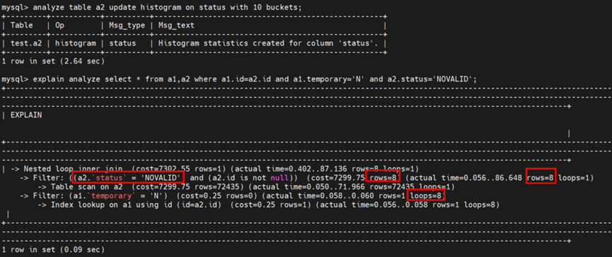 从上图可以看出,有了直方图后,优化器选择了a2驱动a1, a2表过滤后估算的行数为8,实际也为8,a1作为被驱动表只扫描了8次。执行总耗时87ms,效率提升了3倍。