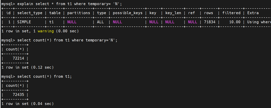 举个例子;执行语句:explain select * from t1 where temporary= 'N';对t1表的字段 temporary 进行等值过滤。