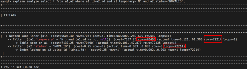 从图中可以看出优化器选择了a1驱动a2, a1表过滤后估算的行数为7049,而实际为72214,a2表作为被驱动表被扫描72214次。执行总耗时280ms。 下面对a2表的status列收集直方图,然后再执行关联查询,如下图所示: