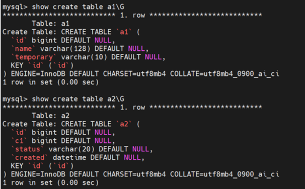 a1,a2两个表做关联查询。两个表结构信息如下图所示: