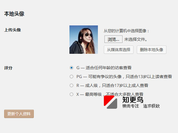之后,WP后台 → 用户 → 我的个人资料,在个人资料设置页面,会发现下面多出本地头像设置功能。