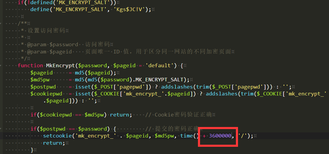 如下图所示,在'MkEncrypt.php'文件中找到对应红色框中的紫色数字,修改即可,数字越小,需要再次输入密码访问所需时间越短