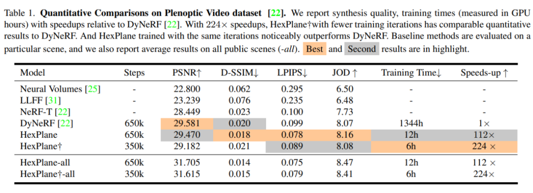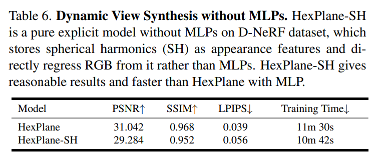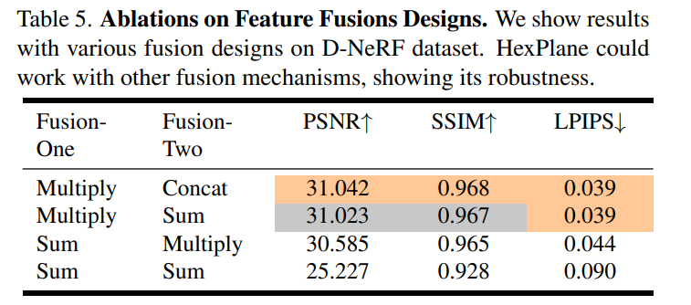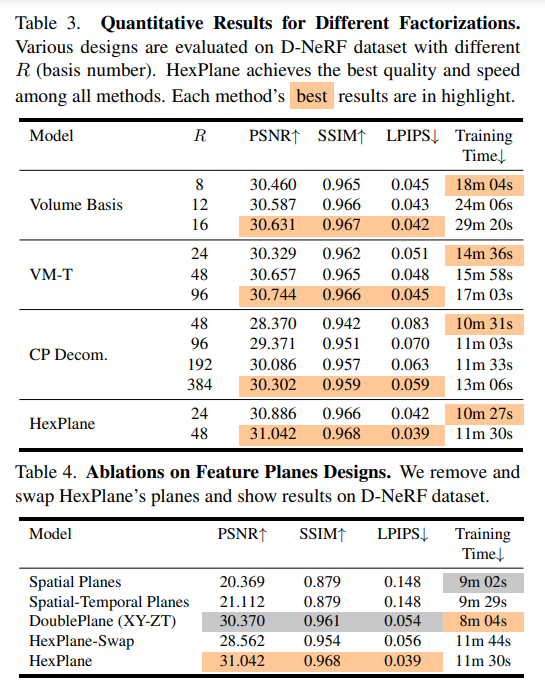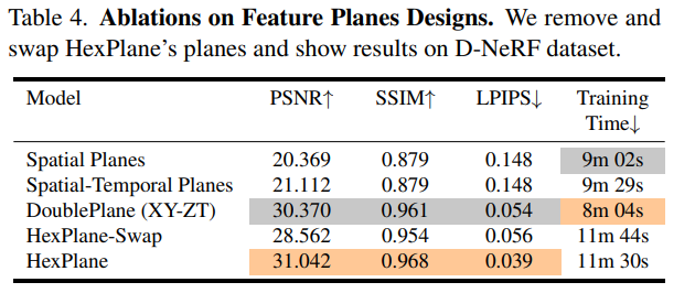 研究者还比较了 HexPlane 与表 3 中方法提到的部分其他设计: