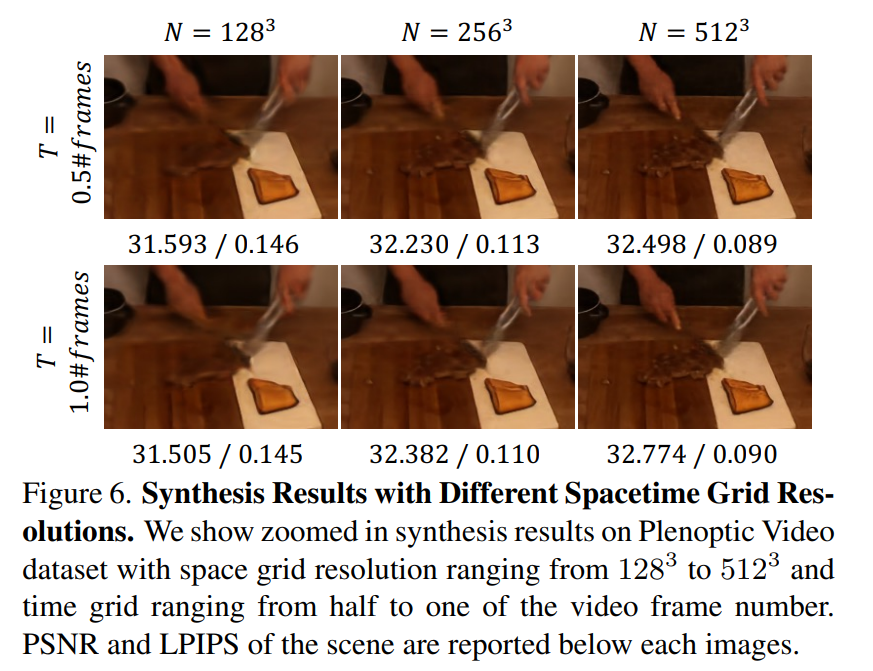HexPlane 很简洁,且为上述挑战提供了一个巧妙的解决方案。由于它的因子化表征,HexPlane 的内存占用的空间只与场景分辨率成四等分。此外,每个平面的分辨率可以独立调整,以适应需要空间和时间可变容量的场景。由于一些平面仅依赖于空间坐标(例如 XY),通过构建 HexPlane,可以促进不相交的时间步长之间的信息共享。