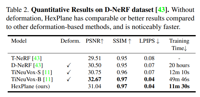 D-NeRF 数据集的定量结果如表 2 所示:
