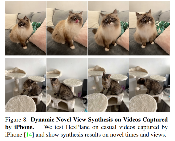 研究者采用 iPhone 拍摄的单目视频来测试 HexPlane,其相对随意的摄像轨迹更接近真实的用例。具体合成结果见图 8。