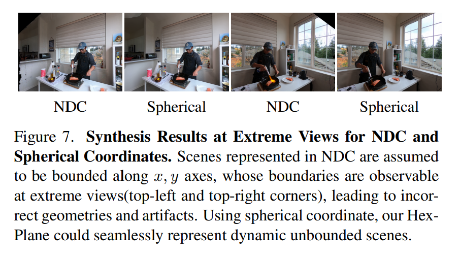 图 7 展示了使用小 x, y 边界的 NDC 的 HexPlane 在极端视图下的合成结果,无法对边界附近或边界外的对象建模。