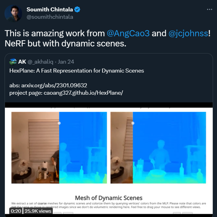 来自的密歇根大学的研究者提出了「HexPlane」,一种能高效合成动态场景新视图的方法。该研究引起了 PyTorch 创始人 Soumith Chintala 的关注。