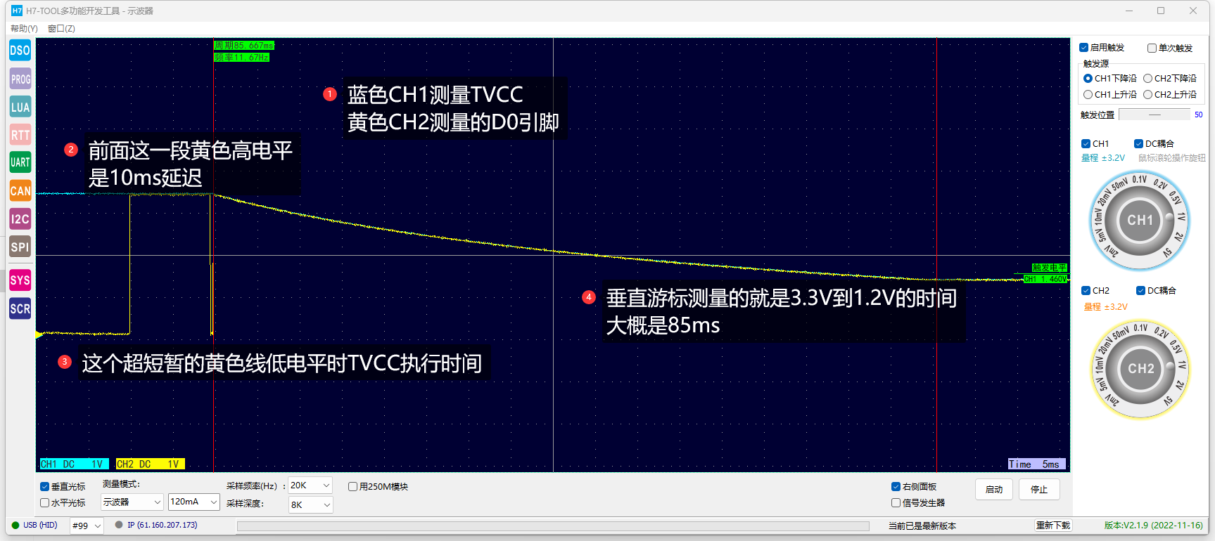 (2)H7-TOOL的TVCC从3.3V输出设置到1.2V需要的时间测量