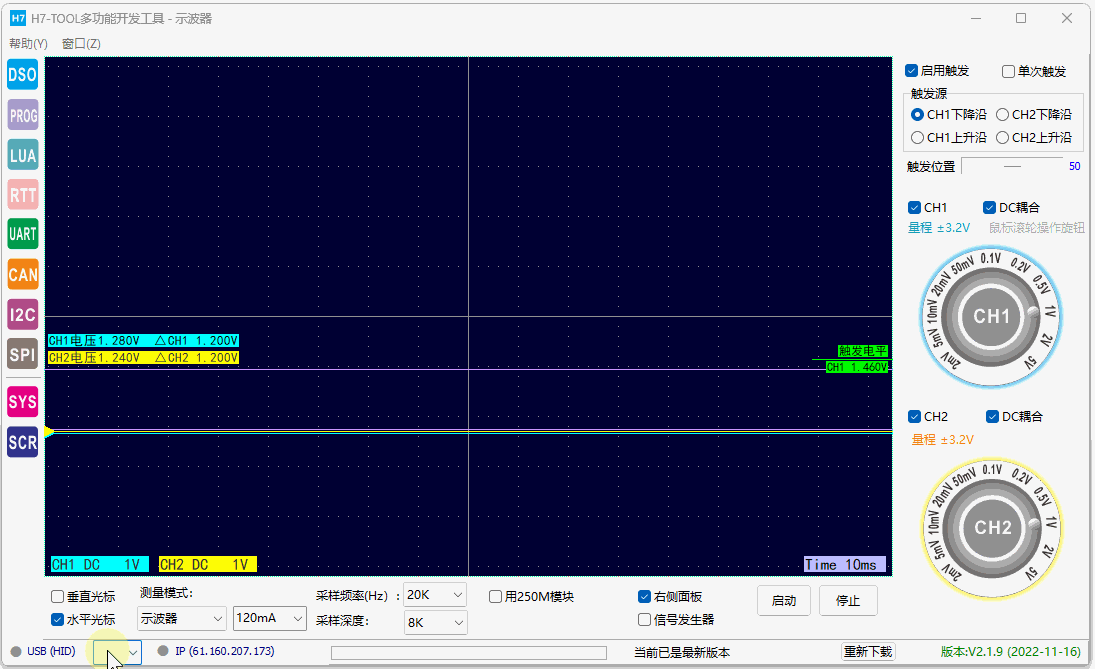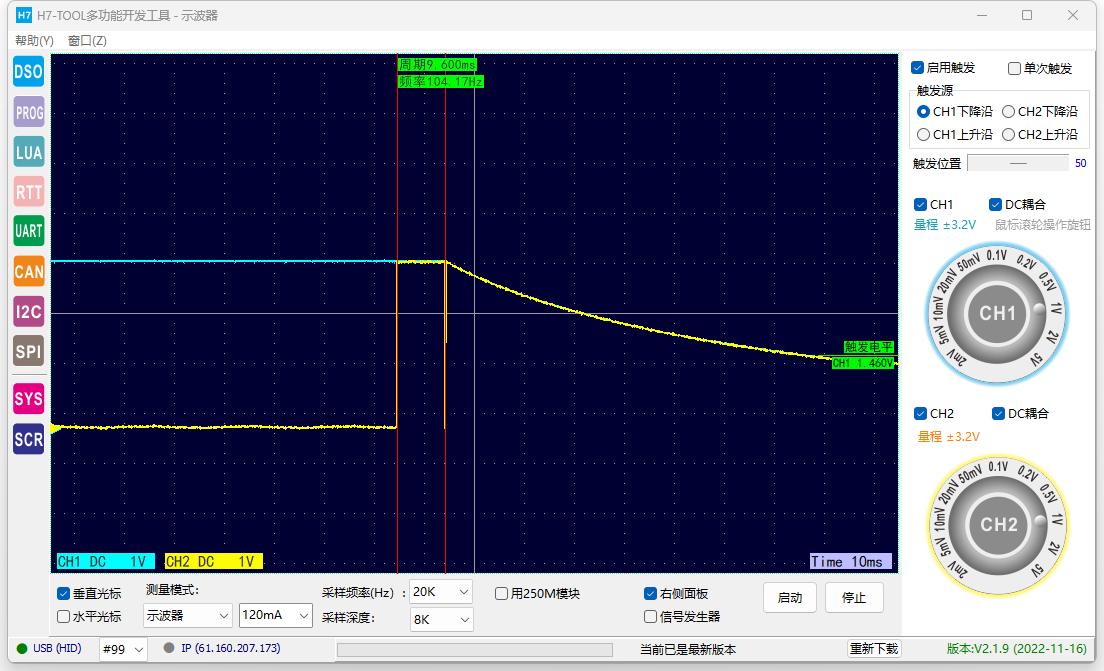 示波器CH1测量的TVCC输出,CH2测试的D0输出,TVCC引脚输出电压值和D0控制引脚的电平是一样的,这个可以看H7-TOOL的原理图双向IO控制。主要是方便控制SPI, SWD,I2C,UART等电平范围。