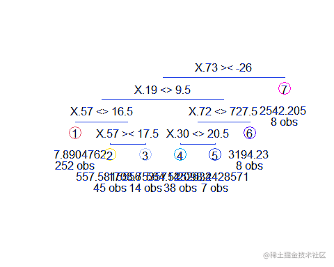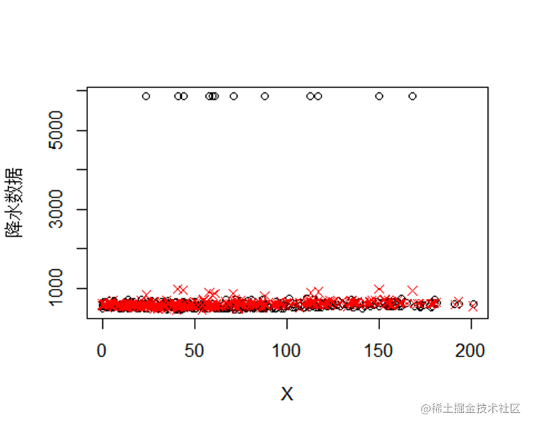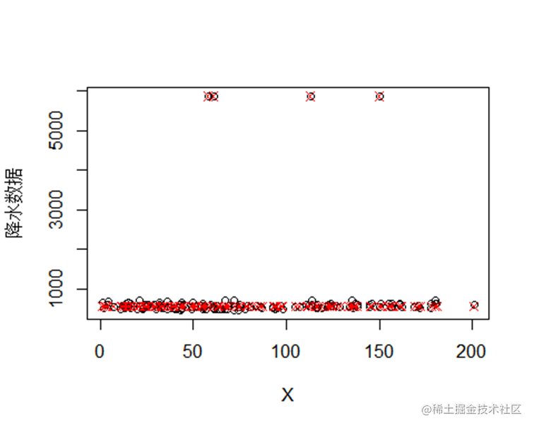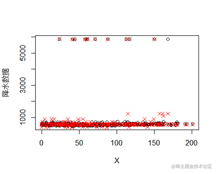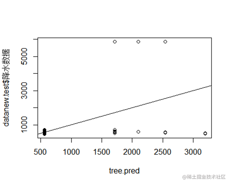 cable[which.min(CARTmodel$cptable[,"xerror"]),"CP"]plot(tree.pred, datanew.test$降水数据 )