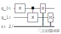 在这个量子电路中,上面的是qubit 0,下面的是qubit 1,整个线路从左到右运行,比特从左到右依次通过,每个门。