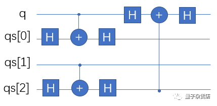 前面写好的foo,就可以被用于不同的量子比特上,以构建一个更大的量子程序,例如我们可以把这一段线路作用在q和qs上: