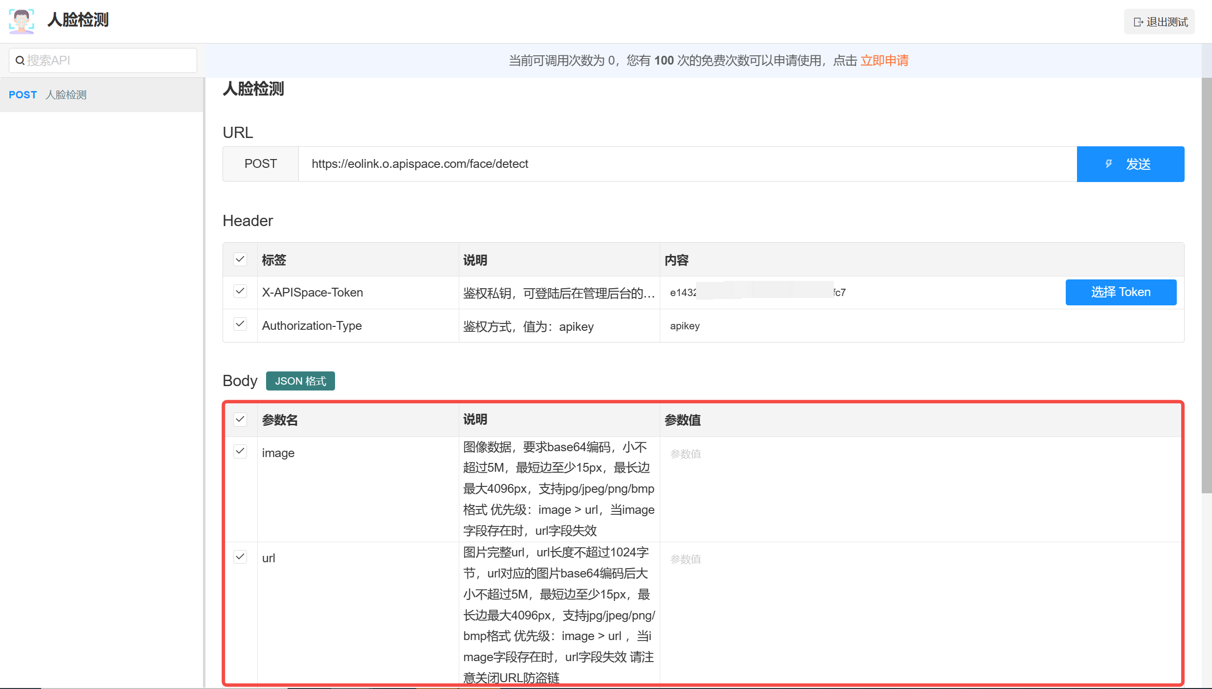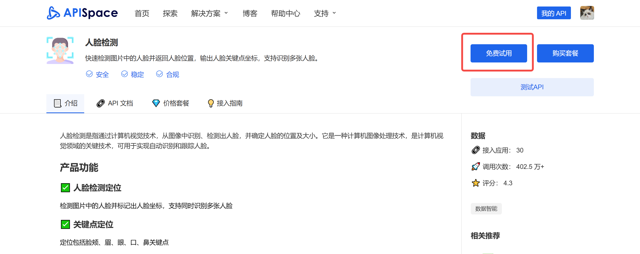 1.注册登录 APISpace ,进入 人脸检测详情页 领取【免费流量】
