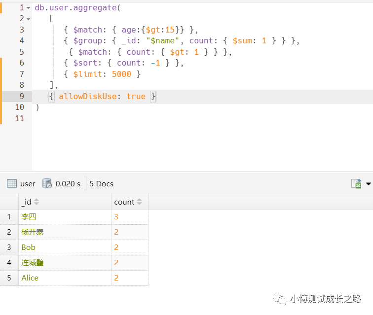 接下来看一下在mongo中,分组统计与筛选的用法。这里不介绍具体的用法,直接展示查询语句: