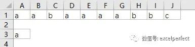 我们要统计“a”在单元格区域A1:J1中连续出现的最大次数,显示应该为4。那么,如何使用公式得到这个结果呢?