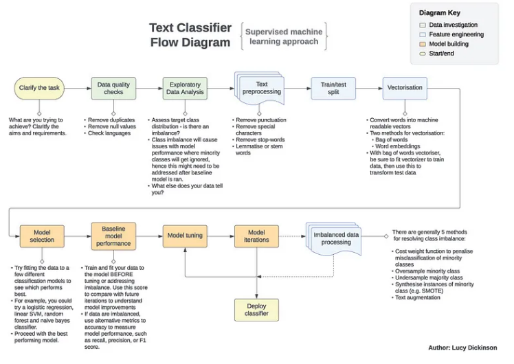 我将首先提供一个流程图,该流程图包含所有必要的步骤和要理解的关键点,从阐明任务到部署训练有素的文本分类器。