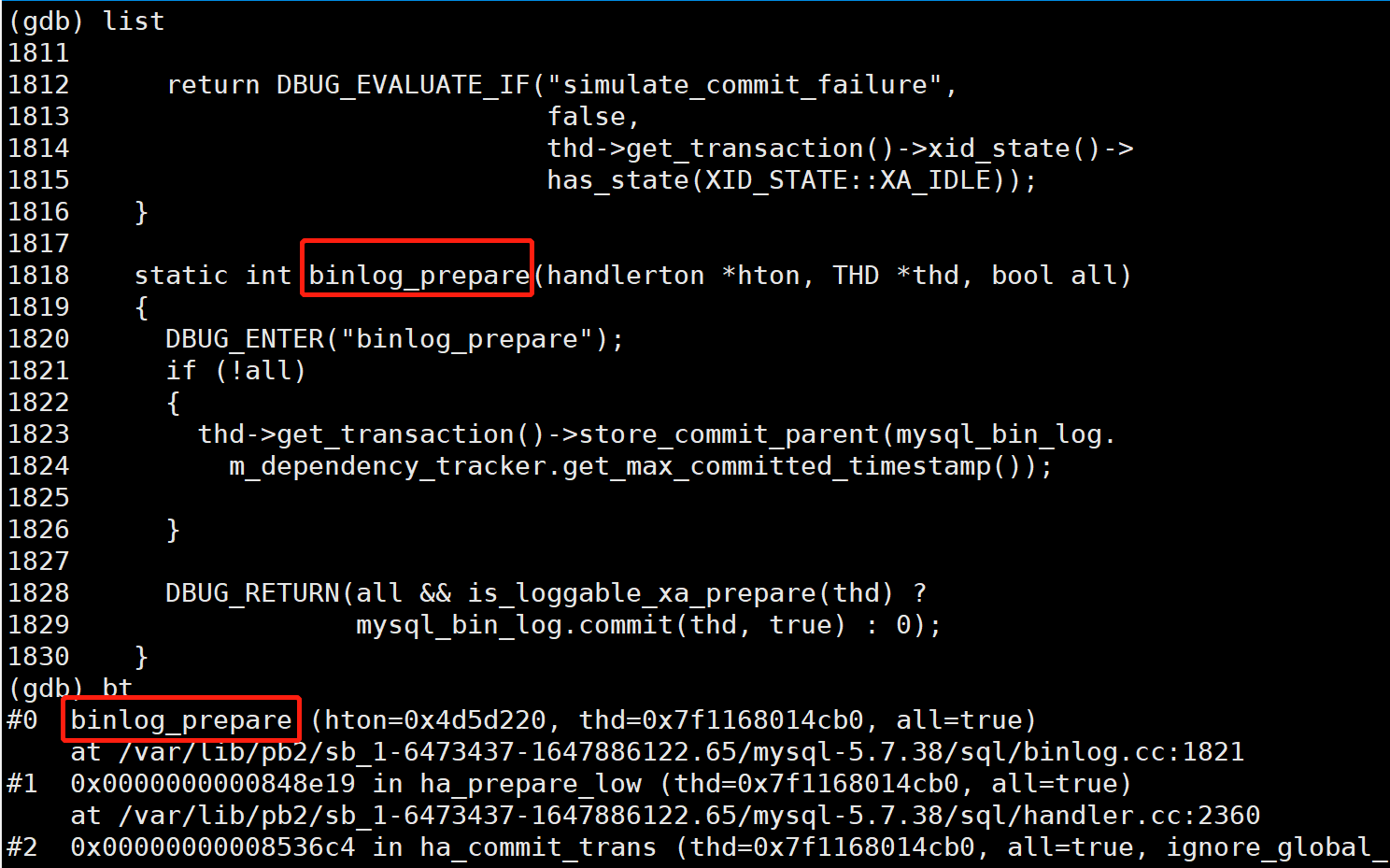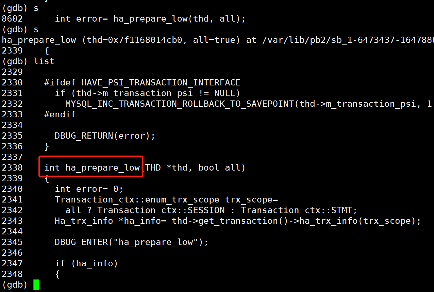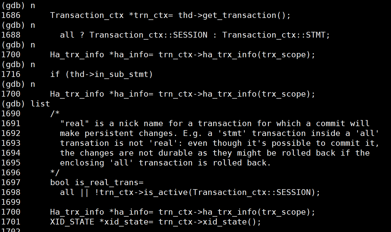 再使用list看下代码, 发现commit_owned_gtids, 在事务prepare之前,保存gtid信息, 我们并不关系它怎么保存的, 所以使用next执行代码(直接执行完函数,不会进入函数)