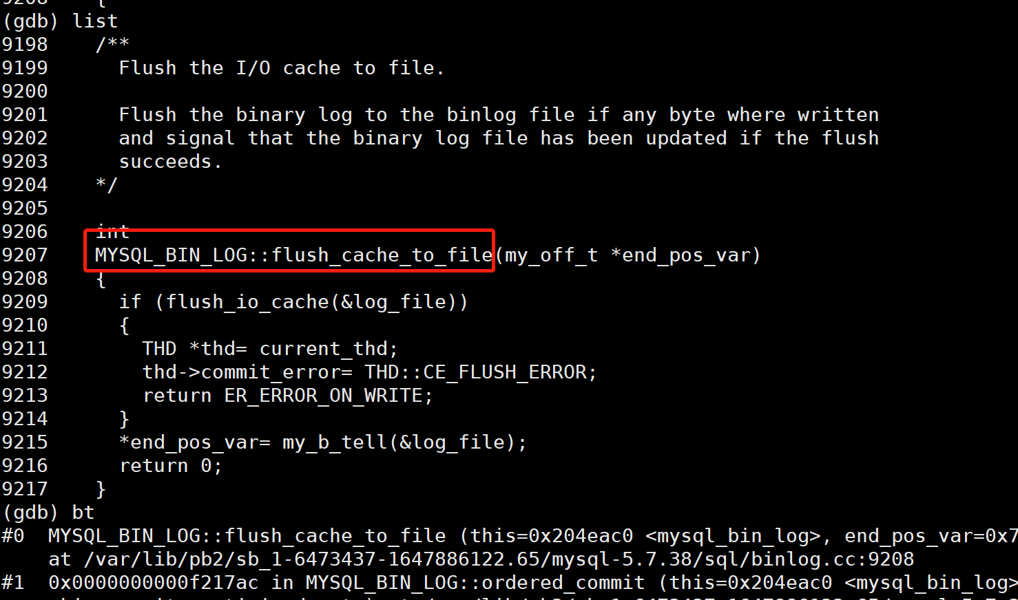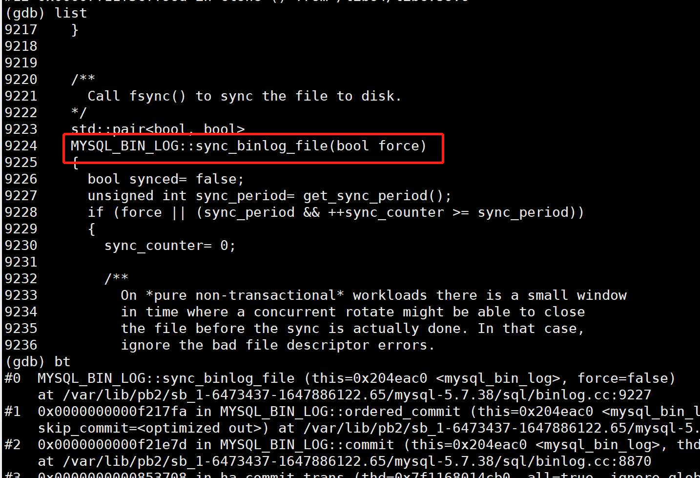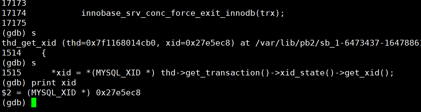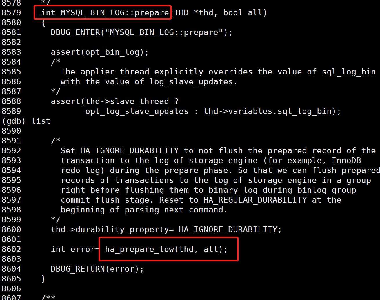 再使用list看下代码, 发现commit_owned_gtids, 在事务prepare之前,保存gtid信息, 我们并不关系它怎么保存的, 所以使用next执行代码(直接执行完函数,不会进入函数)