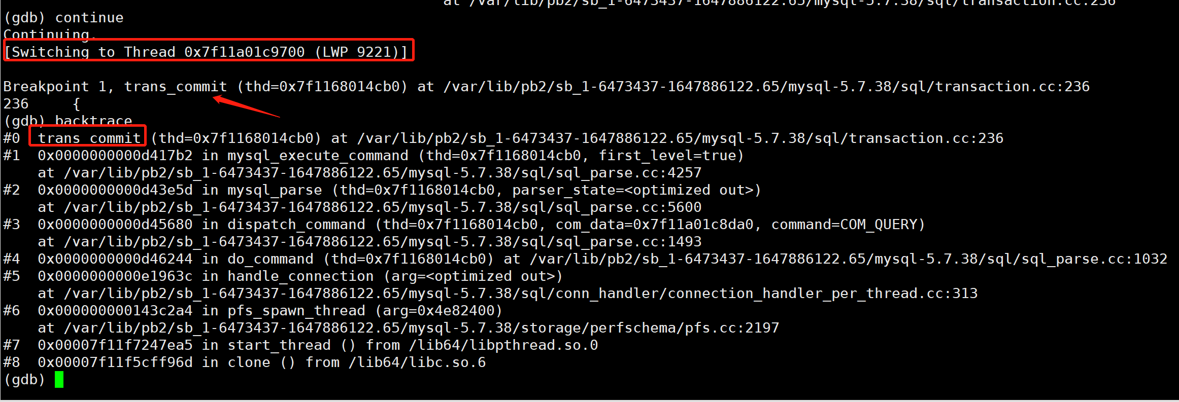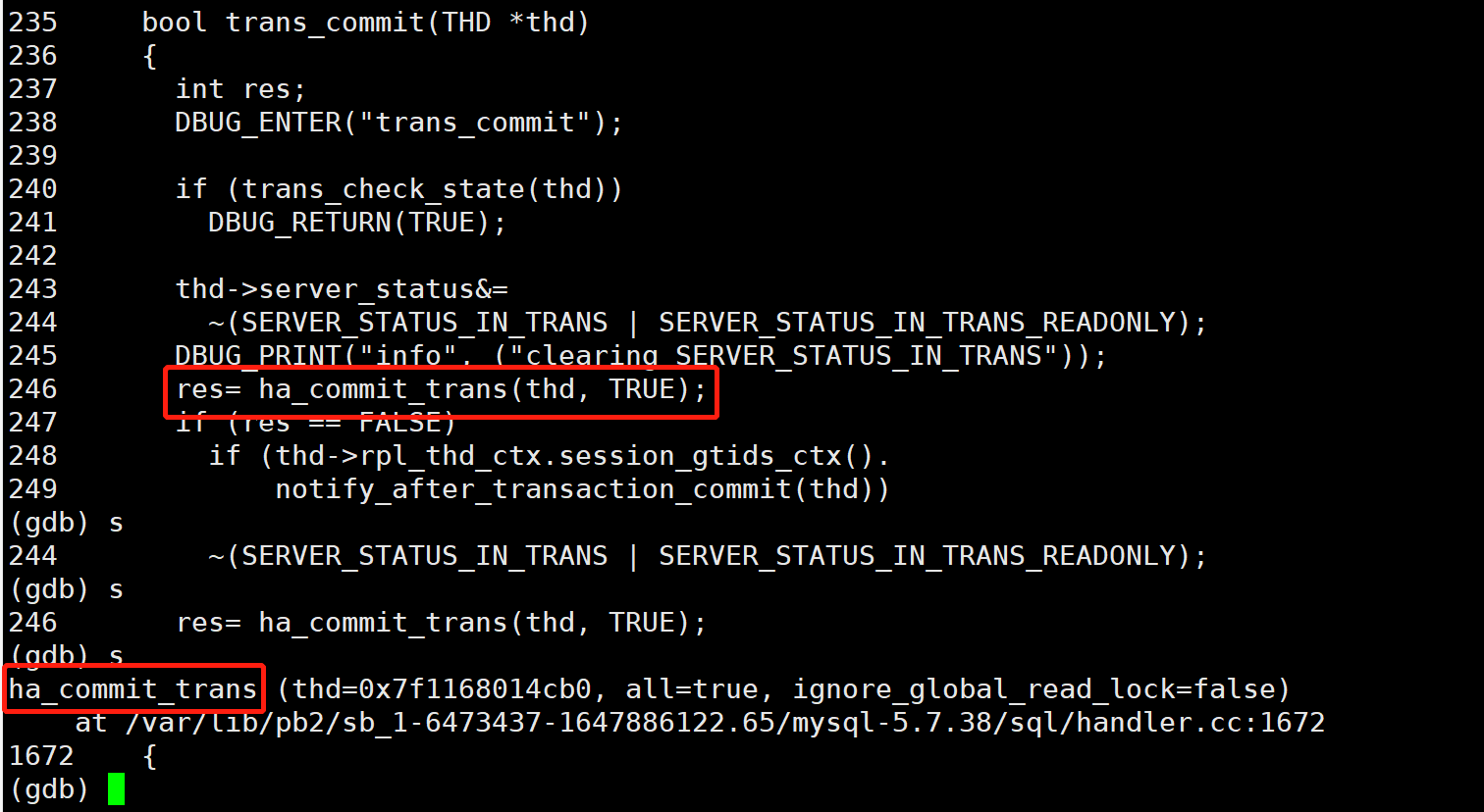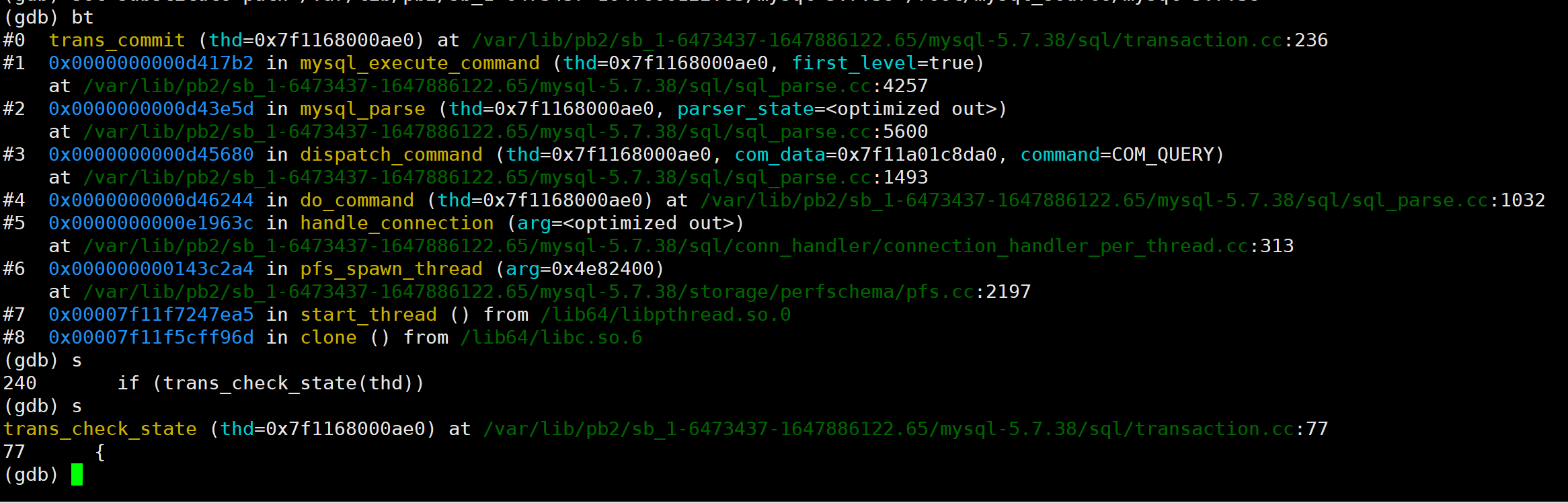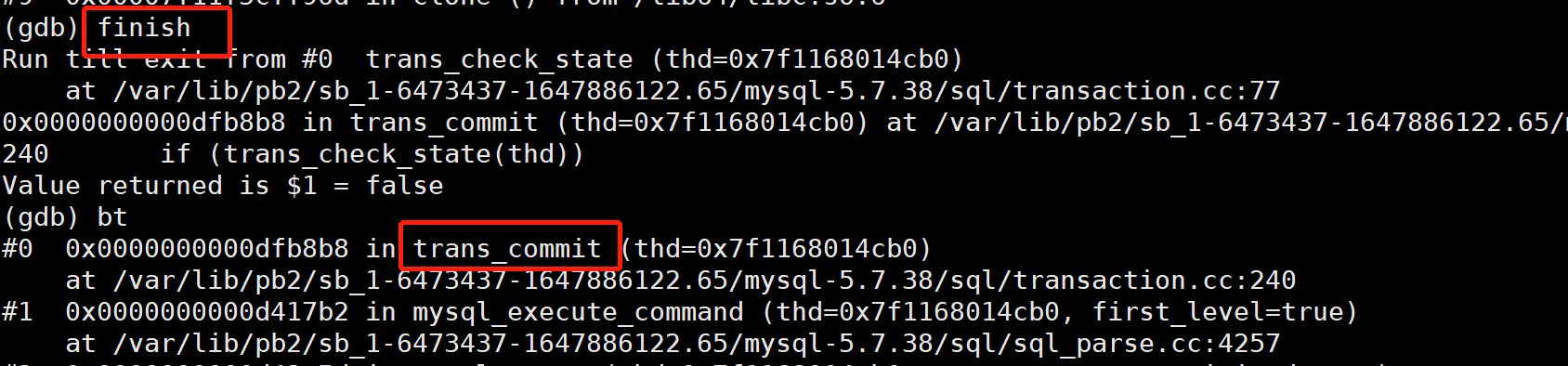 此时, 代码就停在trans_commit处, 可以使用bt查看frame信息, 也可以step/next运行代码, 也可以finish完成当前frame代码.