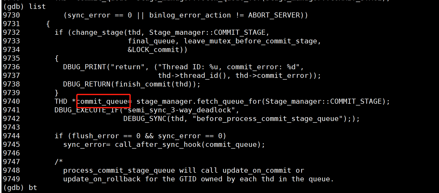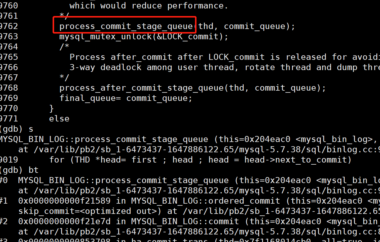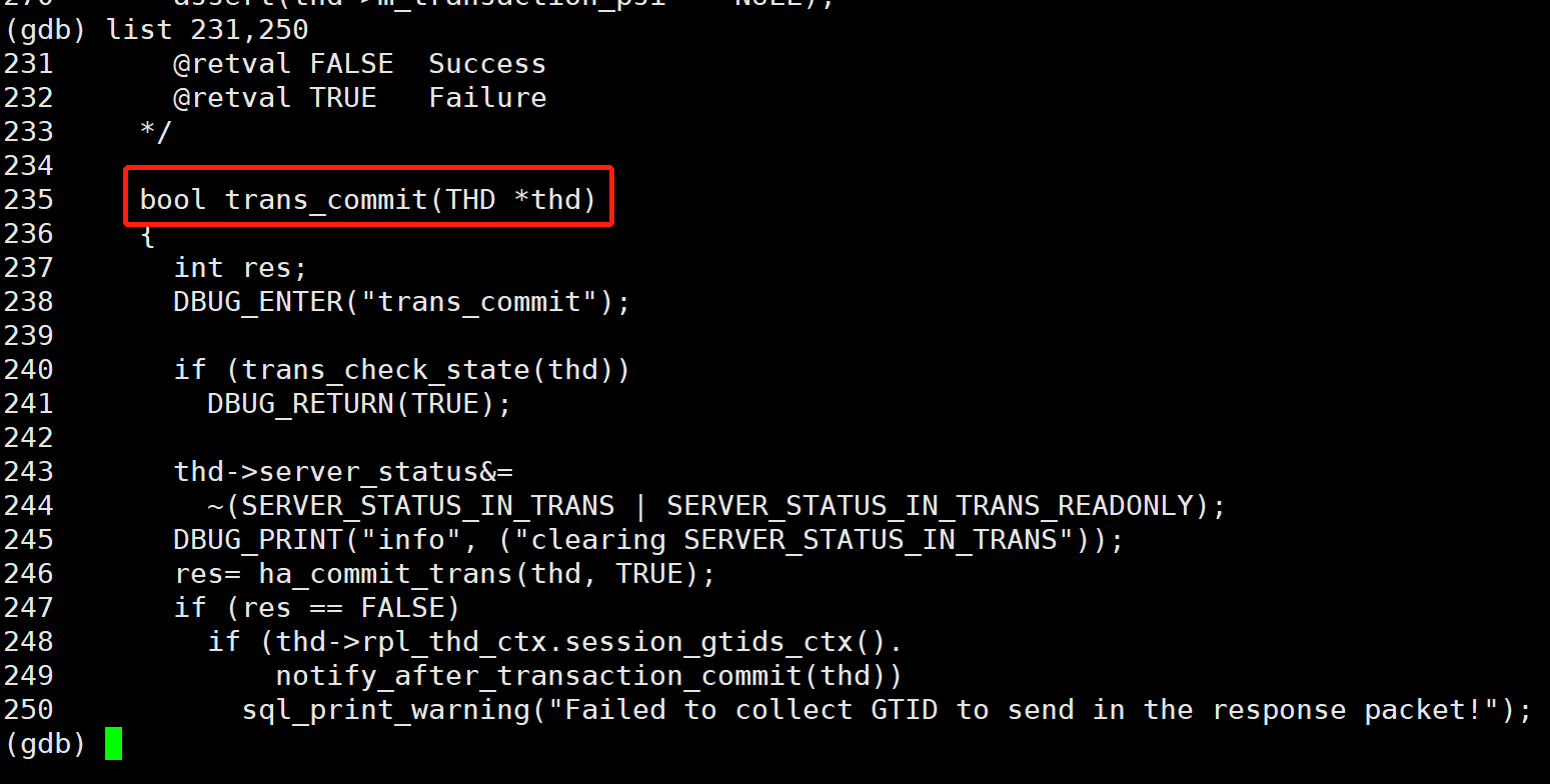 此时, 代码就停在trans_commit处, 可以使用bt查看frame信息, 也可以step/next运行代码, 也可以finish完成当前frame代码.