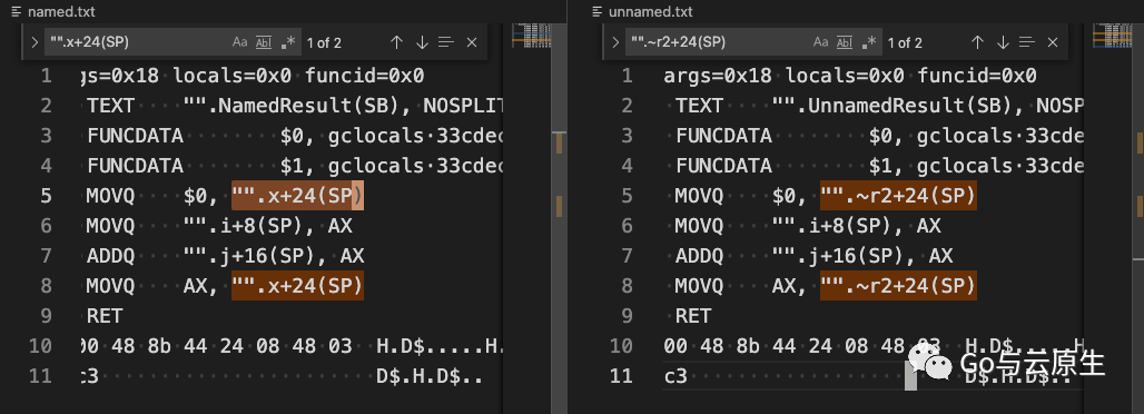 UnnamedResult 代码中没有显式的提供返回值的变量名, 但是 golang 自动为我们生成了一个叫 ~r2 变量名, 其 等价于 NamedResult 函数中的变量xRET后没有带任何参数(SP) , ex: MOVQ AX, "".~r2+24(SP)既然如此, 我们就将所有函数的写法全部统一, 不再区分 命名的、 匿名的 , 默认的, 指定的