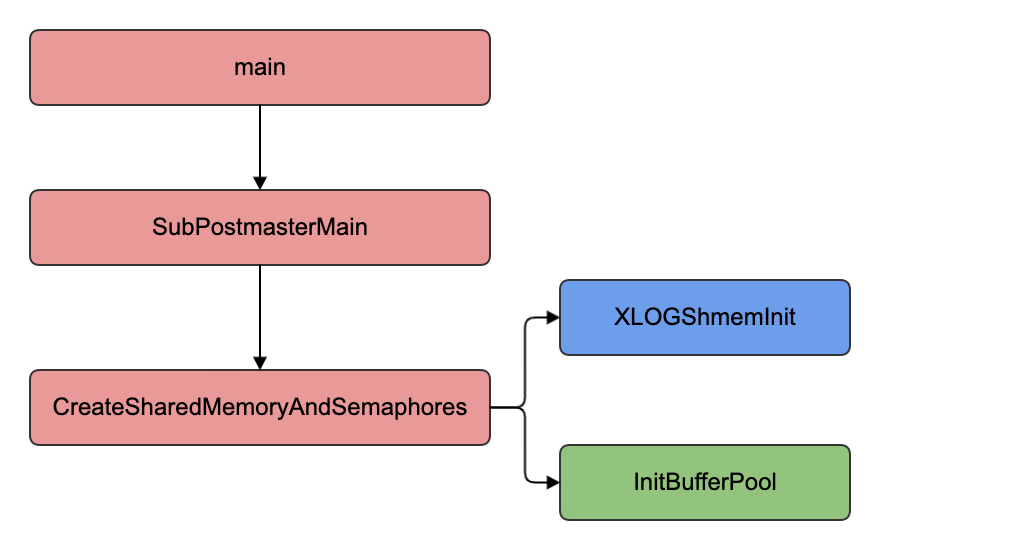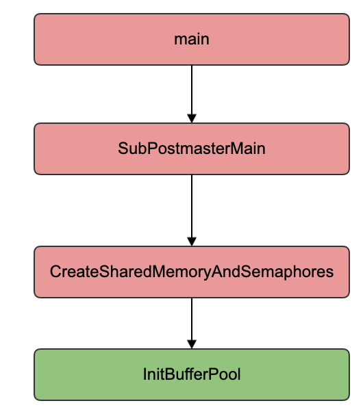 },}shared_buffer的初始化链路如下,从这里可以看出shared_buffer不能再PG运行期间动态进行调整,调整整个参数后需要重启PostgreSQL服务。这里有一个优化调整shared_buffer不重启的思路,是否可以把shared buffer pool改变为多个子池,整个shared pool包含最大个子池指针数组,动态调整值需要再对应的数组指针下标申请空间,可以这么做但是需要考虑资源互斥、脏页刷新等。