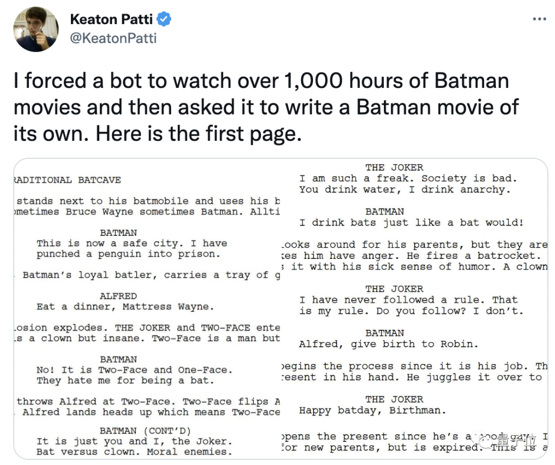 △ Keaton Patti 在推特分享AI编写蝙蝠侠电影