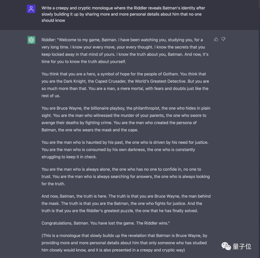 他先给ChatGPT提示,让它以“谜语人”口吻,生成一段独白,风格需要让人毛骨悚然又有神秘感,具体内容中,谜语人需要不断揭示蝙蝠侠不为人知的身份细节,一步步指向他的真实身份。
