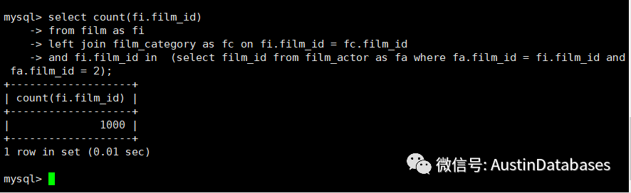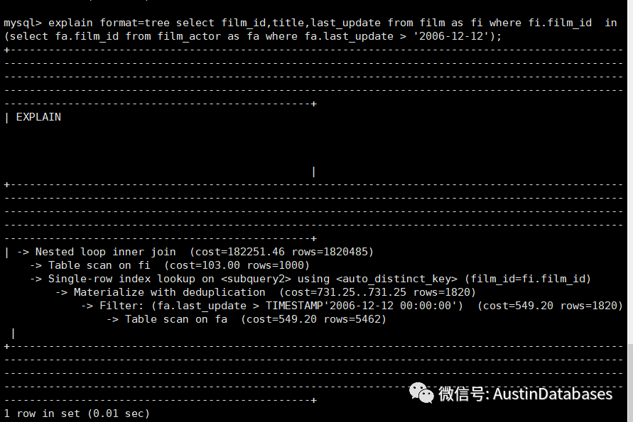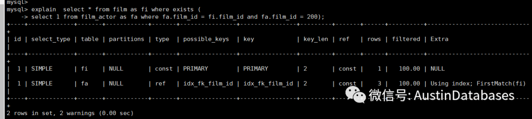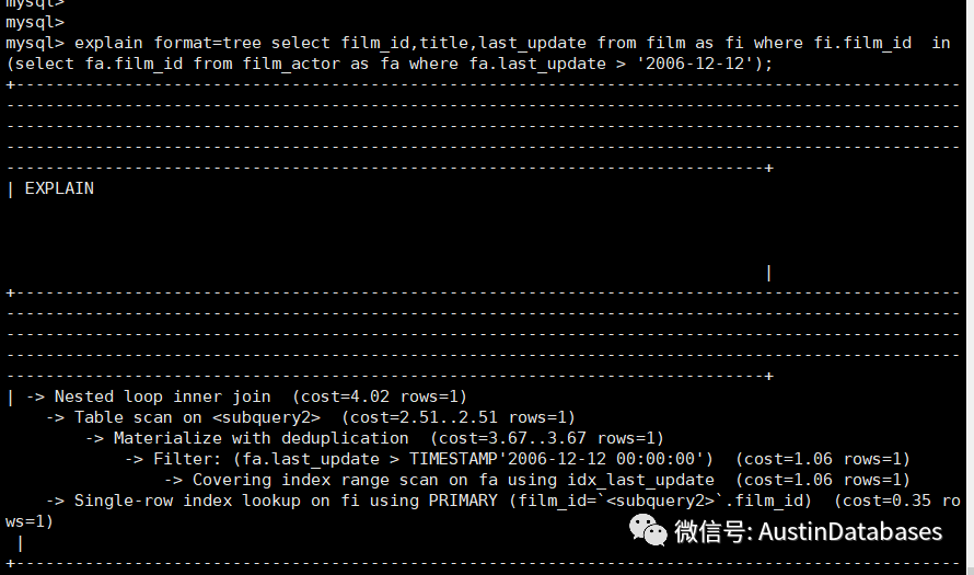 第一个语句并没有出现materialize with deduplication,而是通过索引连接的方式将子查询进行了处理,原因是因为两个表的主键都包含了 film_id 并且子查询中的条件也是主键包含,所以语句优化的过程中并没有出现 materialize with deduplication.