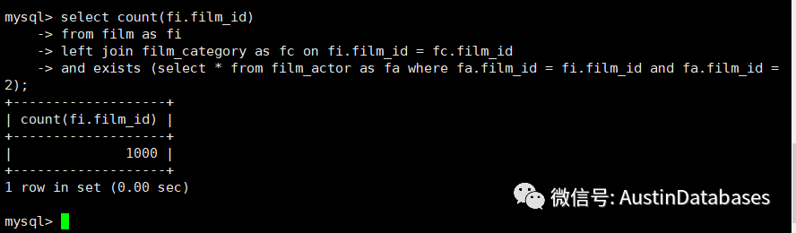 and exists (select * from film_actor as fa where fa.film_id = fi.film_id and fa.film_id = 2);